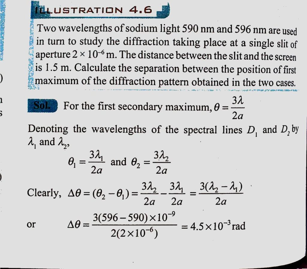 Two wavelengths of sodium light 590 nm and 596 nm are used in turn to study the diffraction taking place at a single slit of aperture 2 * 10^-6 m. The distance between the slit and the screen is 1.5 m. Two adjacent natural frequencies of an organ pipe are formed to be 550 Hz and 650 Hz. Calculate the fundamental frequency and length of this pipe.(Give velocity of sound in air 350 m/s) September 6, 2020 Category: Uncategorised (JEE Advanced Physics by BM Sharma + GMP Solutions) , Facebook Messenger WhatsApp Share this:TwitterFacebook Related
