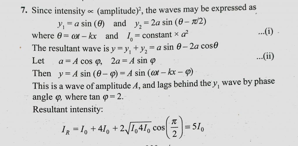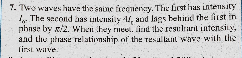 Two waves have the same frequency. The first has intensity I0. The second has intensity 4I0 and lags behind the first in phase by pie/2. When they meet, find the resultant intensity, find the resultant intensity Two waves have the same frequency. The first has intensity I0. The second has intensity 4I0 and lags behind the first in phase by pie/2. When they meet November 5, 2020 Category: Uncategorised (JEE Advanced Physics by BM Sharma + GMP Solutions) , Facebook Messenger WhatsApp Share this:TwitterFacebook Related