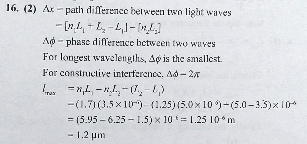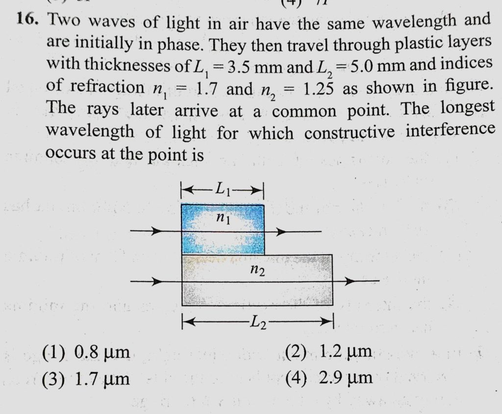 Two waves of light in air have the same wavelength and are initially in phase. They then travel through plastic layers with thicknesses of L1 = 3/5 mm and L2 = 5.0 mm and indices of refraction Two waves of light in air have the same wavelength and are initially in phase. They then travel through plastic layers with thicknesses of L1 = 3/5 mm and L2 = 5.0 mm and indices of refraction October 10, 2020 Category: Uncategorised (JEE Advanced Physics by BM Sharma + GMP Solutions) , Facebook Messenger WhatsApp Share this:TwitterFacebook Related