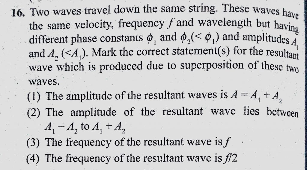 Two waves travel down the same string. These waves have the same velocity, frequency f and wavelength but having different phase constants phi 1 and phi 2 (< phi1) and amplitudes A1 frequency f and wavelength but having different phase constants phi 1 and phi 2 (< phi1) and amplitudes A1 Two waves travel down the same string. These waves have the same velocity November 6, 2020 Category: Uncategorised (JEE Advanced Physics by BM Sharma + GMP Solutions) , Facebook Messenger WhatsApp Share this:TwitterFacebook Related