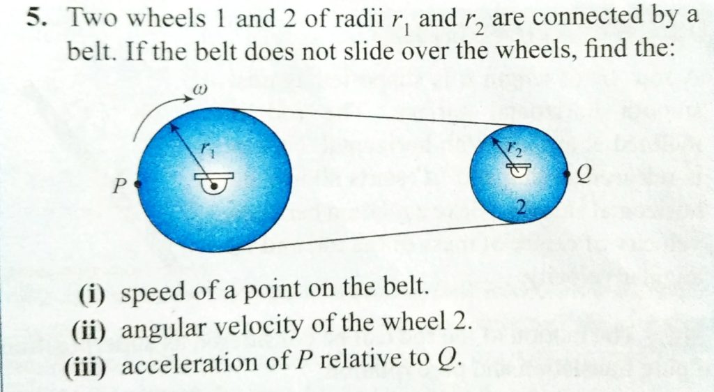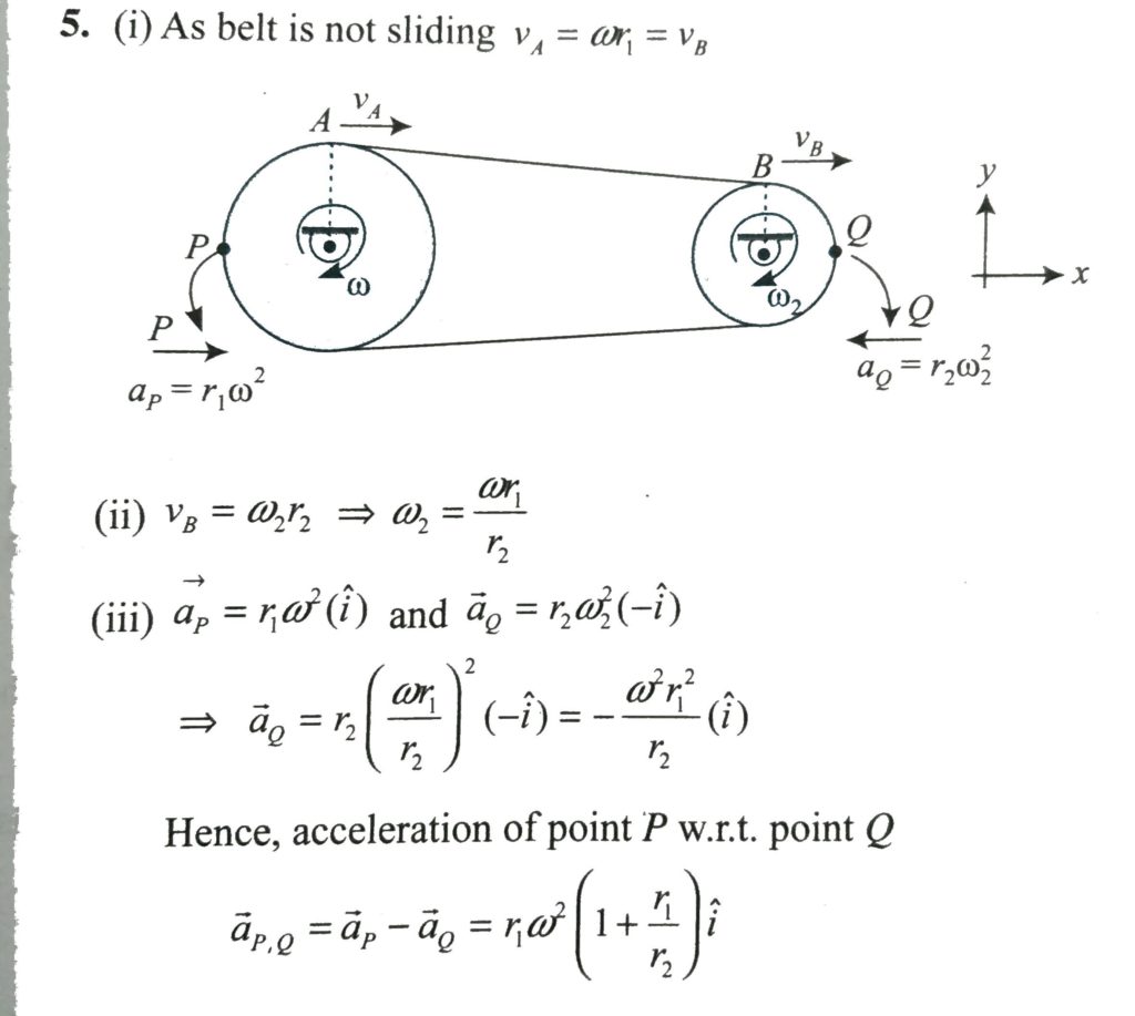 Two wheels 1 and 2 of radii r1 and r2 are connected by a belt. If the belt does not slide over the wheels, find the i) speed of a point on the belt. ii) angular velocity of the wheel 2. iii) acceleration of P relative to Q. find the i) speed of a point on the belt. ii) angular velocity of the wheel 2. iii) acceleration of P relative to Q. Two wheels 1 and 2 of radii r1 and r2 are connected by a belt. If the belt does not slide over the wheels September 25, 2020 Category: Uncategorised (JEE Advanced Physics by BM Sharma + GMP Solutions) , Facebook Messenger WhatsApp Share this:TwitterFacebook Related