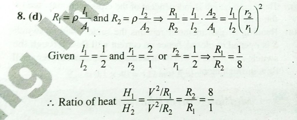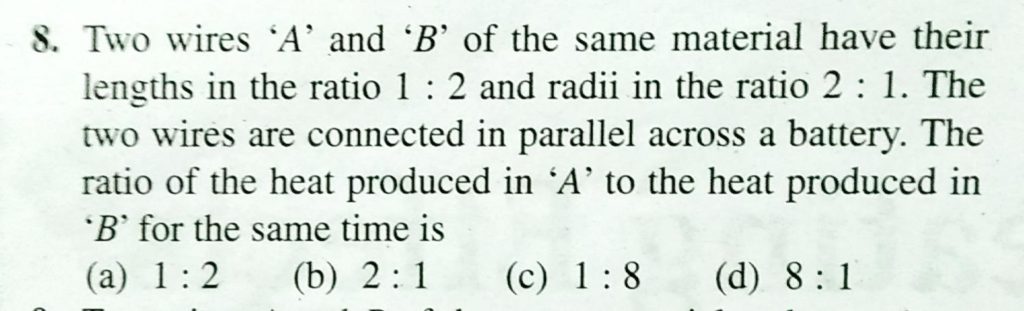 Two wires A and B of the same material have lengths in the ratio 1 : 2 and radii in the ratio 2 : 1. The two wires are connected in parallel across a battery. The ratio of the heat produced in A to the heat produced in B for the same time is A resistor R1 dissipates the power P when connected to a certain generator. If the resistor R2 is put in series with R1 the power dissipated by R1 September 20, 2020 Category: Uncategorised (JEE Advanced Physics by BM Sharma + GMP Solutions) , Facebook Messenger WhatsApp Share this:TwitterFacebook Related