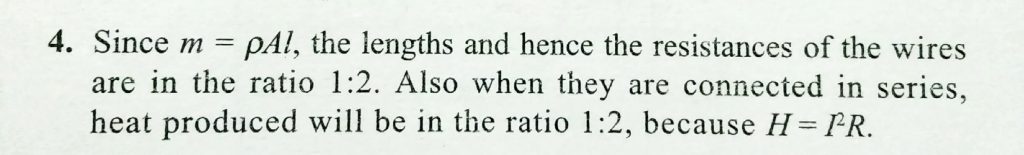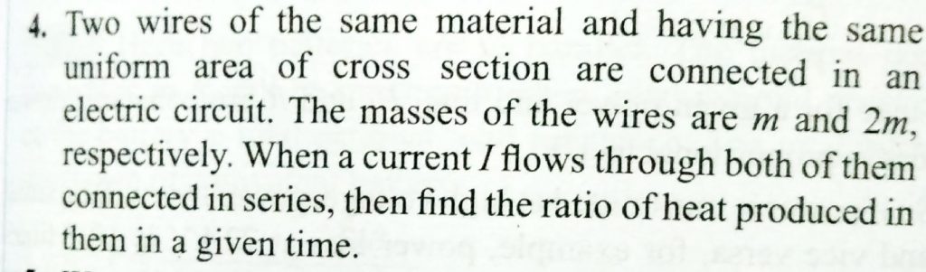 Two wires of the same material and having the same uniform area of cross section are connected in an electric circuit. The masses of the wires are mand2m, respectively. When a current I flows through both of them connected in series, then find the ratio of heat produced in them in a given time .