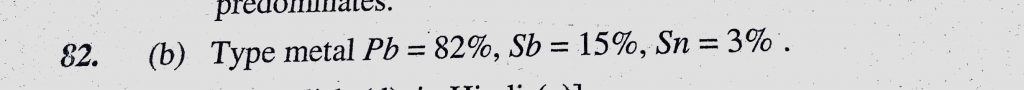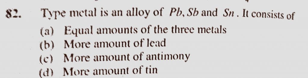 Type metal is an alloy of Pb, Sb and Sn. It consists of (a) Equal amounts of the three metals (b) More amount of lead (c) More amount of antimony Sb and Sn. It consists of (a) Equal amounts of the three metals (b) More amount of lead (c) More amount of antimony Type metal is an alloy of Pb November 18, 2020 Category: Uncategorised (JEE Advanced Physics by BM Sharma + GMP Solutions) , Facebook Messenger WhatsApp Share this:TwitterFacebook Related