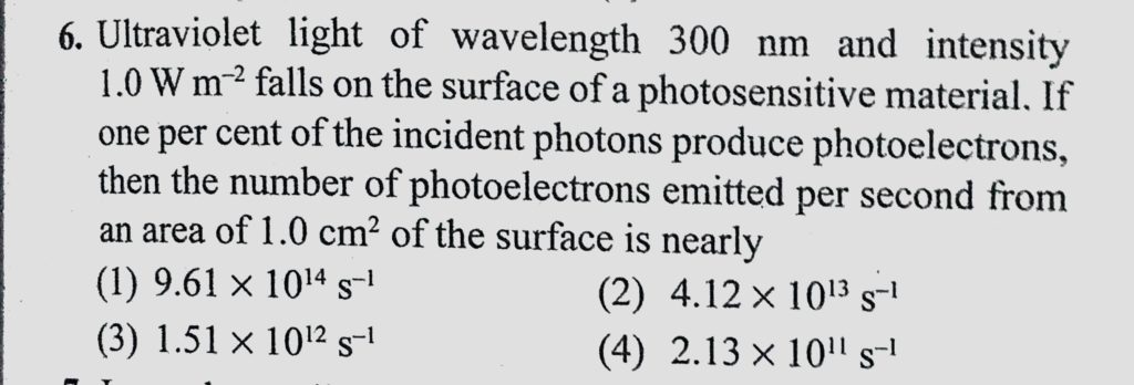 Ultravoilet light of wavelength 300 nm and intensity 1.0 W/m^2 falls on the surface of a photosensitive material. If one per cent of the incident photons produce photoelectrons, Ultravoilet light of wavelength 300 nm and intensity 1.0 W/m^2 falls on the surface of a photosensitive material. If one per cent of the incident photons produce photoelectrons October 12, 2020 Category: Uncategorised (JEE Advanced Physics by BM Sharma + GMP Solutions) , Facebook Messenger WhatsApp Share this:TwitterFacebook Related