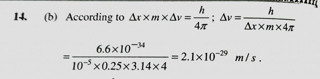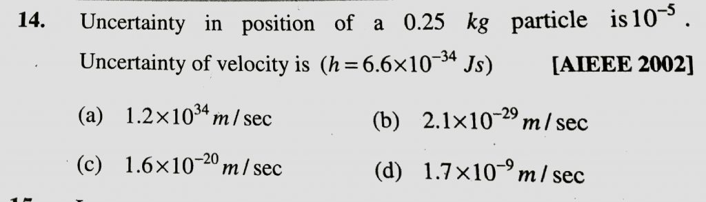 Uncertainity in position of a 0.25 kg particle is 10^-5 uncertainity of velocity is ( h = 6.6 x 10^-34 Js ) Uncertainity in position of a 0.25 kg particle is 10^-5 uncertainity of velocity is ( h = 6.6 x 10^-34 Js ) November 28, 2020 Category: Uncategorised (JEE Advanced Physics by BM Sharma + GMP Solutions) , Facebook Messenger WhatsApp Share this:TwitterFacebook Related