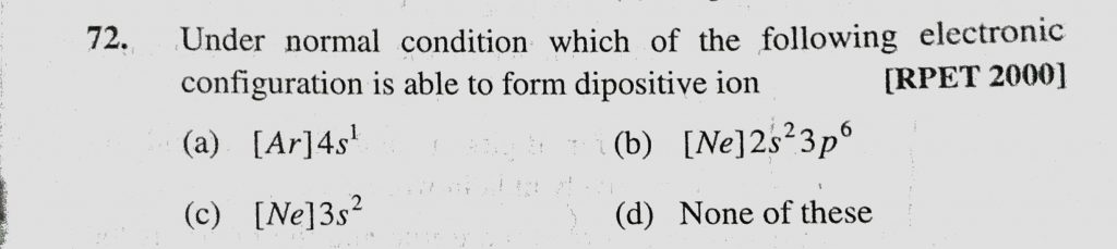 Under normal condition which of the following electronic configuration is able to form dipositive ion Under normal condition which of the following electronic configuration is able to form dipositive ion November 9, 2020 Category: Uncategorised (JEE Advanced Physics by BM Sharma + GMP Solutions) , Facebook Messenger WhatsApp Share this:TwitterFacebook Related
