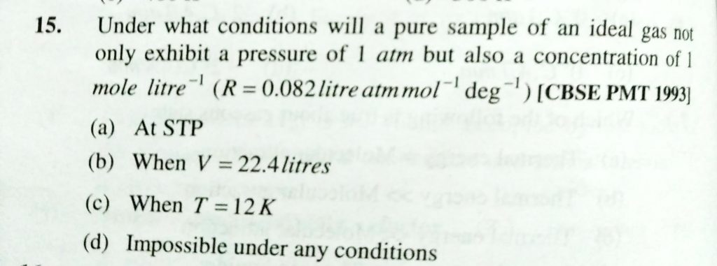 Under what conditions will a pure smaple of an ideal gas not only exhibit a pressure of 1 atm but also a concentration of 1 mole /litre (R= 0.082 L atm /mol /deg) Under what conditions will a pure smaple of an ideal gas not only exhibit a pressure of 1 atm but also a concentration of 1 mole /litre (R= 0.082 L atm /mol /deg) February 10, 2021 Category: Uncategorised (JEE Advanced Physics by BM Sharma + GMP Solutions) , Facebook Messenger WhatsApp Share this:TwitterFacebook Related
