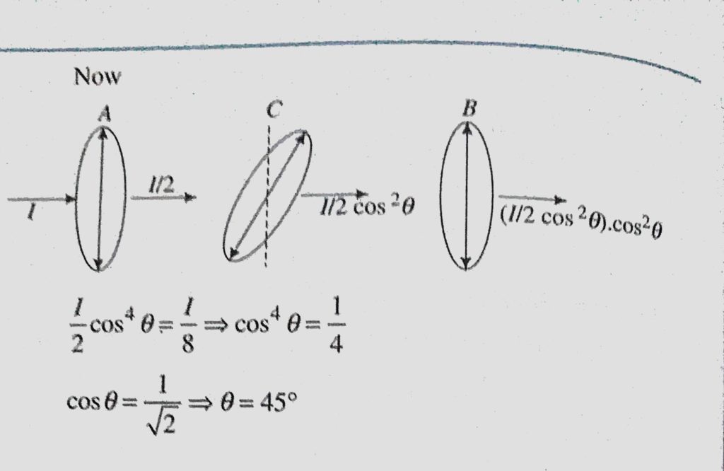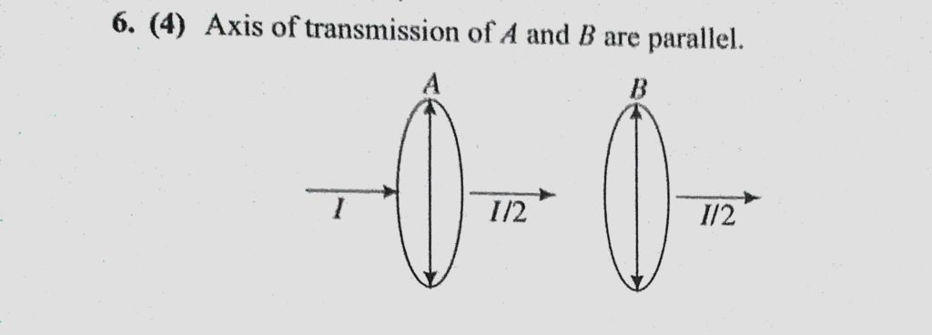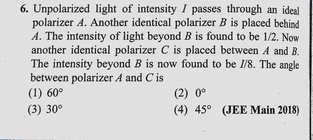 Unpolarized light of intensity I passes through an ideal polarizer A. Another identical polarizer B is placed behind A. The intensity of light beyond B is found to be 1/2. Now another identical Unpolarized light of intensity I passes through an ideal polarizer A. Another identical polarizer B is placed behind A. The intensity of light beyond B is found to be 1/2. Now another identical October 12, 2020 Category: Uncategorised (JEE Advanced Physics by BM Sharma + GMP Solutions) , Facebook Messenger WhatsApp Share this:TwitterFacebook Related