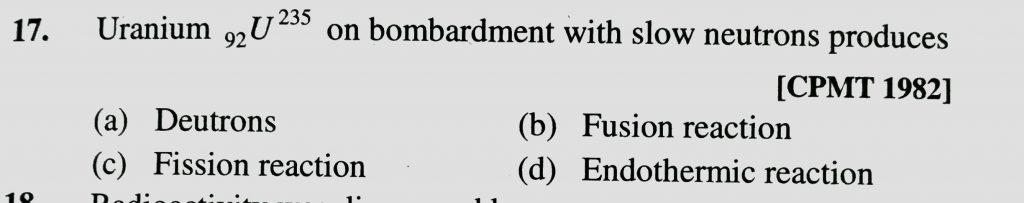 Uranium 92 U ^235 on ba=ombardment with slow neutrons produces (a) Deutrons (b) Fusion reaction (c) Fission reaction (d) Endothermic reaction Uranium 92 U ^235 on ba=ombardment with slow neutrons produces (a) Deutrons (b) Fusion reaction (c) Fission reaction (d) Endothermic reaction February 13, 2021 Category: Uncategorised (JEE Advanced Physics by BM Sharma + GMP Solutions) , Facebook Messenger WhatsApp Share this:TwitterFacebook Related
