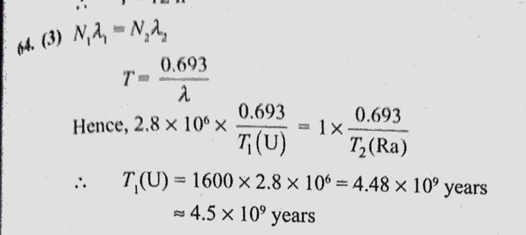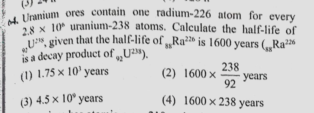 Uranium ores contain one radium-226 atom for every 2.8 * 10^6 uranium-238 atoms. Calculate the half-life of 92U238, given that the half-life of 88Ra226 is 1600 years (88Ra226 is a decay product of 92U238). given that the half-life of 88Ra226 is 1600 years (88Ra226 is a decay product of 92U238). Uranium ores contain one radium-226 atom for every 2.8 * 10^6 uranium-238 atoms. Calculate the half-life of 92U238 October 18, 2020 Category: Uncategorised (JEE Advanced Physics by BM Sharma + GMP Solutions) , Facebook Messenger WhatsApp Share this:TwitterFacebook Related