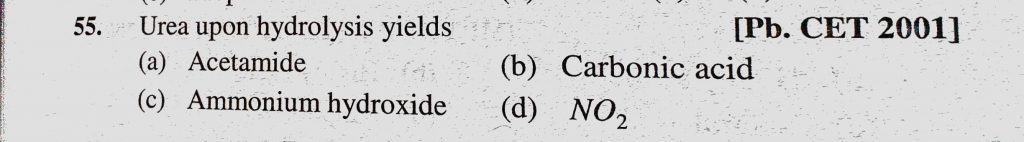 Urea upon hydrolysis yields (a) Acetamide (b) Carbonic acid (c) Ammonium hydroxide (d) NO2 Urea upon hydrolysis yields (a) Acetamide (b) Carbonic acid (c) Ammonium hydroxide (d) NO2 February 13, 2021 Category: Uncategorised (JEE Advanced Physics by BM Sharma + GMP Solutions) , Facebook Messenger WhatsApp Share this:TwitterFacebook Related