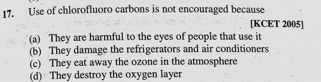 Use of chlorofluoro carbons is not encouraged because (a) They are harmful to the eyes of people that use it (b) They damage the refrigerators and air conditioners Use of chlorofluoro carbons is not encouraged because (a) They are harmful to the eyes of people that use it (b) They damage the refrigerators and air conditioners February 9, 2021 Category: Uncategorised (JEE Advanced Physics by BM Sharma + GMP Solutions) , Facebook Messenger WhatsApp Share this:TwitterFacebook Related