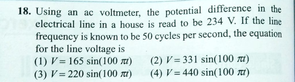 Using an ac voltmeter , the potential difference in the electrical line in a house is read to be 234 V. If the line frequency is known to be 50 cycles per second, the equation for the line voltage is the equation for the line voltage is the potential difference in the electrical line in a house is read to be 234 V. If the line frequency is known to be 50 cycles per second Using an ac voltmeter October 27, 2020 Category: Uncategorised (JEE Advanced Physics by BM Sharma + GMP Solutions) , Facebook Messenger WhatsApp Share this:TwitterFacebook Related