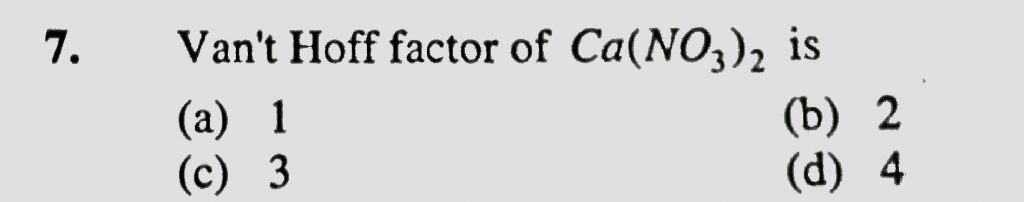 Van’t Hoff factor of Ca(NO3)2 is (a) 1 (b) 2 (c) 3 (d) 4 Van't Hoff factor of Ca(NO3)2 is (a) 1 (b) 2 (c) 3 (d) 4 December 14, 2020 Category: Uncategorised (JEE Advanced Physics by BM Sharma + GMP Solutions) , Facebook Messenger WhatsApp Share this:TwitterFacebook Related