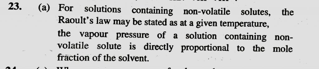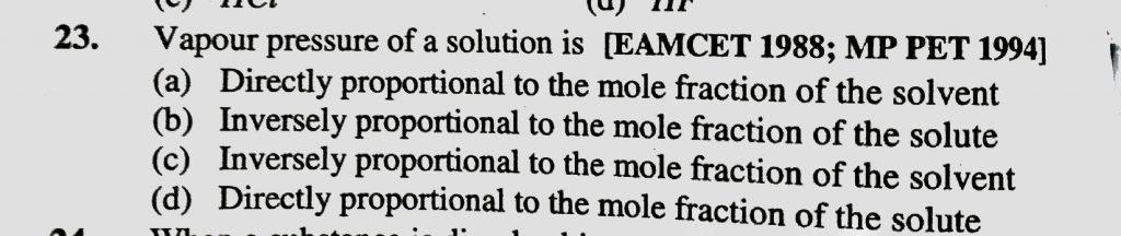 Vapour pressure of a solution is (a) Directly proportional to the mole fraction of the solvent (b) Inversely proportional to the mole fraction of the solvent (c) Inversely proportional to the mole fraction of the solvent The relative lowering of vapour pressure of an aqueous solution containing non - volatile solute is 0.0125 . The molality of the solution is December 12, 2020 Category: Uncategorised (JEE Advanced Physics by BM Sharma + GMP Solutions) , Facebook Messenger WhatsApp Share this:TwitterFacebook Related