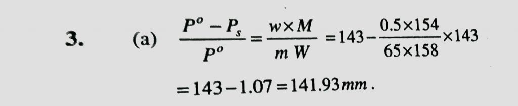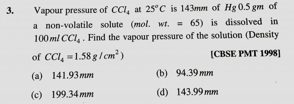 Vapour pressure of CCl 4 at 25 o C is 143 mm of Hg. 0.5 g of a non-volatile solute (mol. Mass =65) is dissolved in 100 mL CCl4 . Find the vapour pressure of the solution: (Density of CCl 4 = 1.58 g/cm 3 ) For 0.1 M solution the colligative property will follow the order (a) NaCL > Na2SO4 > Na3PO4 (b) NaCL < Na2SO4 < Na3PO4 December 12, 2020 Category: Uncategorised (JEE Advanced Physics by BM Sharma + GMP Solutions) , Facebook Messenger WhatsApp Share this:TwitterFacebook Related