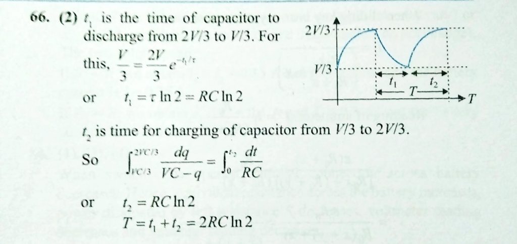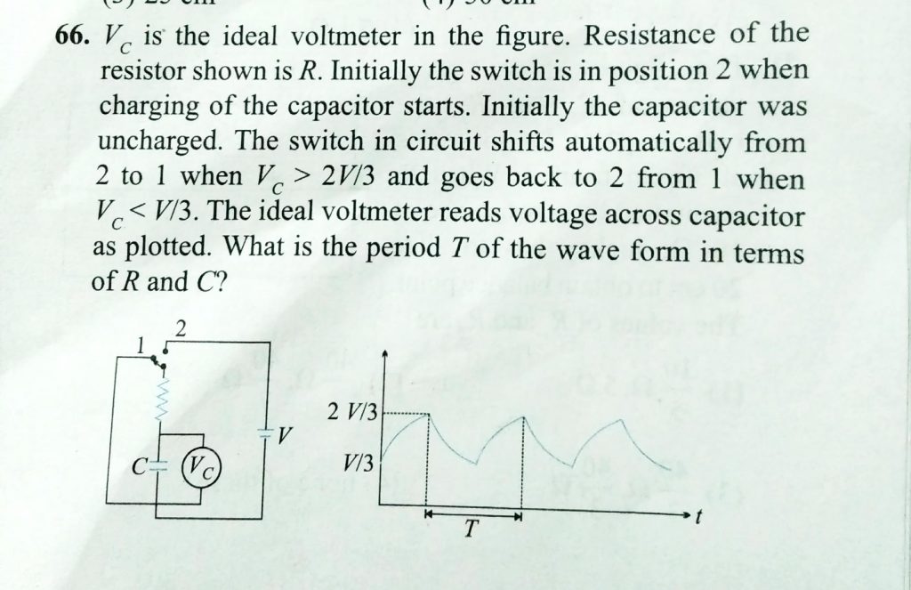 VC is the ideal voltmeter in the figure. Resistance of the resistor shown is R. Initially the switch is in position 2 when charging of the capacitor starts. Initially the capacitor was uncharged. The switch in circuit shifts automatically from 2 to 1 when VC>2V/3 and goes back to 2 from 1 when VC<V/3. The ideal voltmeter reads voltage across capacitor as plotted. What is the period T of the wave from in terms of R and C ?
