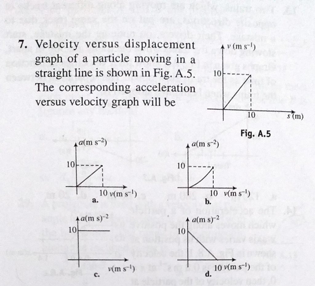 Velocity versus displacement graph of a particle moving in a straight line is shown in Fig. A.5. The corresponding acceleration versus velocity graph will be Velocity versus displacement graph of a particle moving in a straight line is shown in Fig. A.5. The corresponding acceleration versus velocity graph will be September 24, 2020 Category: Uncategorised (JEE Advanced Physics by BM Sharma + GMP Solutions) , Facebook Messenger WhatsApp Share this:TwitterFacebook Related