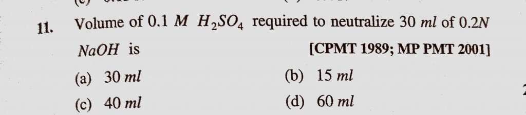 Volume of 0.1 M H2SO4 required to neutralize 30 ml of 0.2 N NaOH is (a) 30 ml (b) 15 ml Volume of 0.1 M H2SO4 required to neutralize 30 ml of 0.2 N NaOH is (a) 30 ml (b) 15 ml December 7, 2020 Category: Uncategorised (JEE Advanced Physics by BM Sharma + GMP Solutions) , Facebook Messenger WhatsApp Share this:TwitterFacebook Related