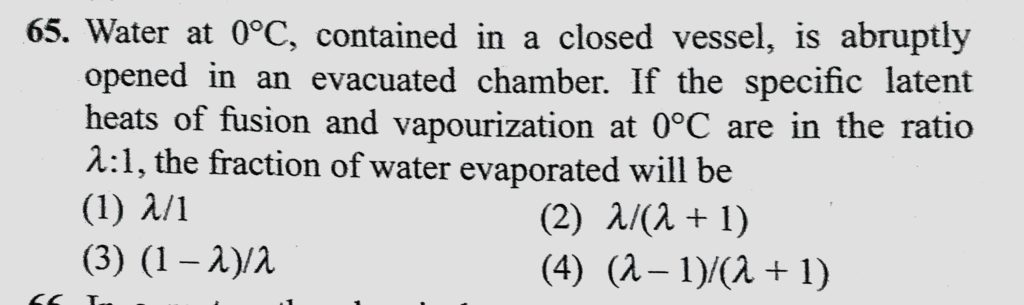 Water at 0 C, contained in a closed vessel, is abruptly opened in an evacuated chamber. If the specific latent heats of fusion and vapourization at 0 C are in the ration lemda : 1, contained in a closed vessel is abruptly opened in an evacuated chamber. If the specific latent heats of fusion and vapourization at 0 C are in the ration lemda : 1 Water at 0 C October 24, 2020 Category: Uncategorised (JEE Advanced Physics by BM Sharma + GMP Solutions) , Facebook Messenger WhatsApp Share this:TwitterFacebook Related
