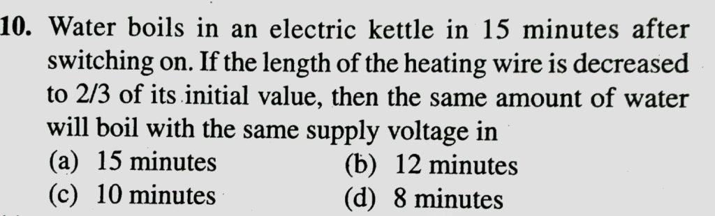 Water boils in an electric kettle in 15 minutes after switching on. If the lenght of the heating wire is decreased to 2/3 of its initial value, then the same amount of water will boil with the same supply voltage in then the same amount of water will boil with the same supply voltage in Water boils in an electric kettle in 15 minutes after switching on. If the lenght of the heating wire is decreased to 2/3 of its initial value September 21, 2020 Category: Uncategorised (JEE Advanced Physics by BM Sharma + GMP Solutions) , Facebook Messenger WhatsApp Share this:TwitterFacebook Related