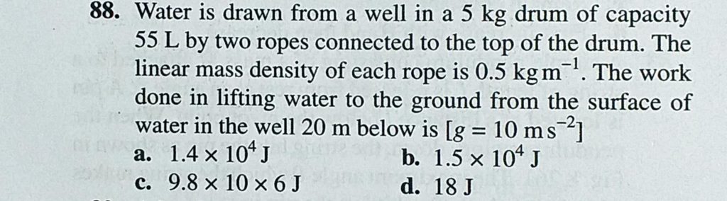 Water is drawn from a well in a 5 kg drum of capacity 55 L by two ropes connected to the top of the drum. The linear mass density of each rope is 0.5 kg/m. The work done in lifting water Water is drawn from a well in a 5 kg drum of capacity 55 L by two ropes connected to the top of the drum. The linear mass density of each rope is 0.5 kg/m. The work done in lifting water October 4, 2020 Category: Uncategorised (JEE Advanced Physics by BM Sharma + GMP Solutions) , Facebook Messenger WhatsApp Share this:TwitterFacebook Related