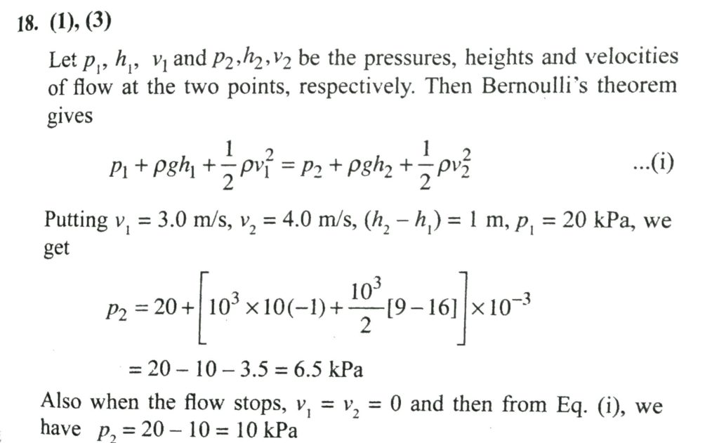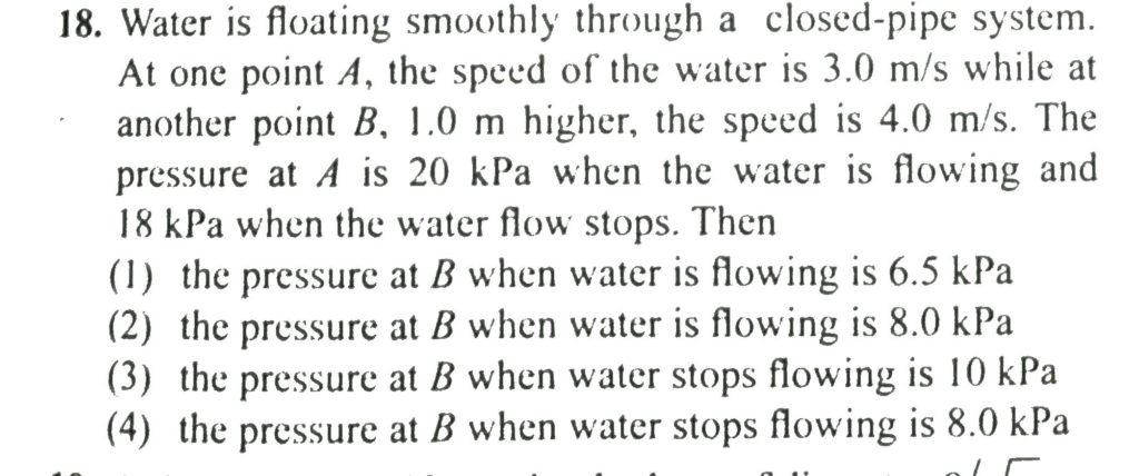 Water is flowing smoothly through a closed-pipe system. At one point the speed of the water is 3.0 m/s. While at another point 1.0 m higher the speed is 4.0 m/s. If the pressure is 20 Kpa when the water is flowing and 18 kpa when the water flows stops . Then