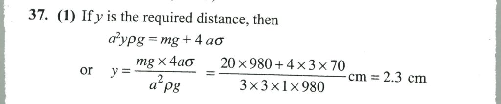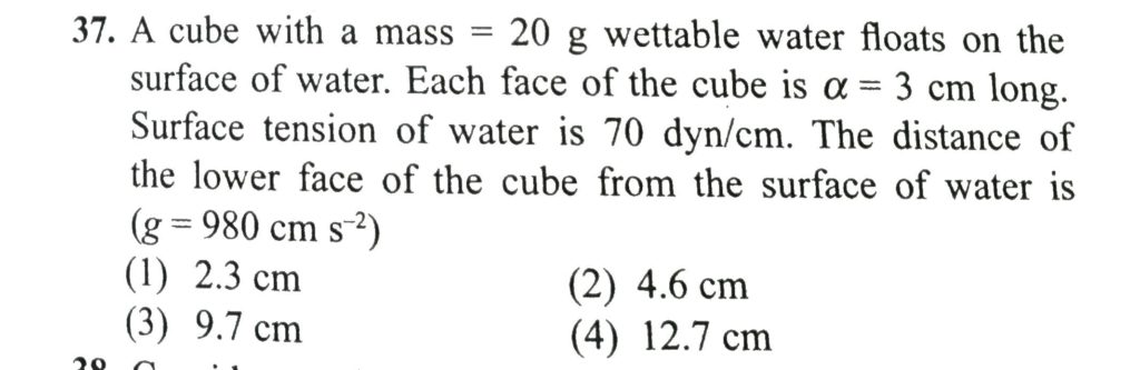 A cube with a mass = 20 g wettable water floats on the surface of water. Each face of the cube is α = 3 cm long. Surface tension of water is 70 dyn/cm. The distance of the lower face of the cube from the surface of water is (g = 980 cm/s^2) Water rises to a height h in a capilliary tube of cross sectional area A. The height to which water will rise in a capilliary tube of cross sectional area 4 A will be October 11, 2020 Category: Uncategorised (JEE Advanced Physics by BM Sharma + GMP Solutions) , Facebook Messenger WhatsApp Share this:TwitterFacebook Related