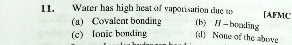 Waterhas high heat of vaporisation due to (a) Covalent bonding (b) H- bonding (c) Ionic bonding (d) none of the above Waterhas high heat of vaporisation due to (a) Covalent bonding (b) H- bonding (c) Ionic bonding (d) none of the above December 9, 2020 Category: Uncategorised (JEE Advanced Physics by BM Sharma + GMP Solutions) , Facebook Messenger WhatsApp Share this:TwitterFacebook Related