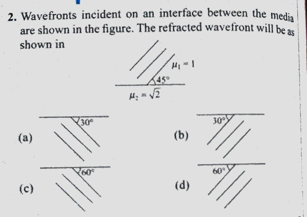 Wavefronts incident on an interface between the media are shown in the figure. The refracted wavefront will be as shown in Wavefronts incident on an interface between the media are shown in the figure. The refracted wavefront will be as shown in October 9, 2020 Category: Uncategorised (JEE Advanced Physics by BM Sharma + GMP Solutions) , Facebook Messenger WhatsApp Share this:TwitterFacebook Related