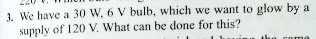 We have a 30 W , 6 V bulb , which we want to glow by a supply of 120 V . what can be done for this ? 6 V bulb We have a 30 W which we want to glow by a supply of 120 V . what can be done for this ? November 15, 2020 Category: Uncategorised (JEE Advanced Physics by BM Sharma + GMP Solutions) , Facebook Messenger WhatsApp Share this:TwitterFacebook Related