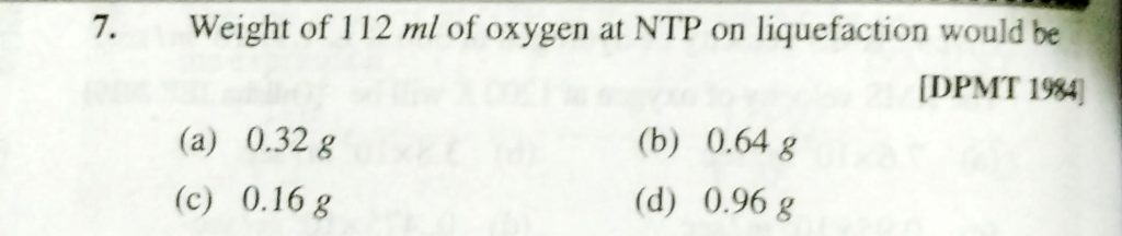 Weight of 112 ml of oxygen at NTP on liquified would be (a) 0.32 g (b) 0.64 g (c) 0.16 g (d) 0.96 g Weight of 112 ml of oxygen at NTP on liquified would be (a) 0.32 g (b) 0.64 g (c) 0.16 g (d) 0.96 g February 12, 2021 Category: Uncategorised (JEE Advanced Physics by BM Sharma + GMP Solutions) , Facebook Messenger WhatsApp Share this:TwitterFacebook Related