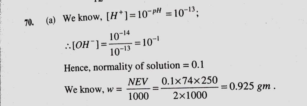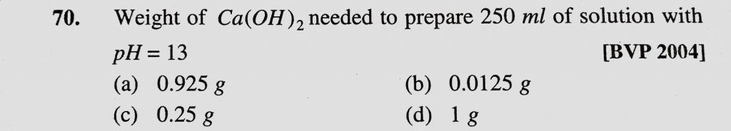 Weight of Ca(OH)2 needed to prepare 250 ml of solution with pH = 13 Weight of Ca(OH)2 needed to prepare 250 ml of solution with pH = 13 December 7, 2020 Category: Uncategorised (JEE Advanced Physics by BM Sharma + GMP Solutions) , Facebook Messenger WhatsApp Share this:TwitterFacebook Related