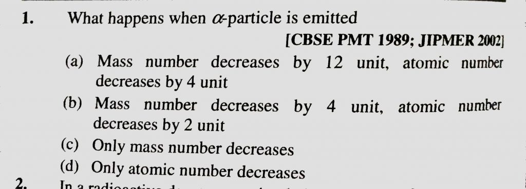 What happens when alpha – particle is emitted (a) mass number decreases by 12 unit , atomic number decreases by 4 unit (b) mass number decreases by 4 unit , atomic number decreases by 2 unit atomic number decreases by 2 unit atomic number decreases by 4 unit (b) mass number decreases by 4 unit What happens when alpha - particle is emitted (a) mass number decreases by 12 unit February 13, 2021 Category: Uncategorised (JEE Advanced Physics by BM Sharma + GMP Solutions) , Facebook Messenger WhatsApp Share this:TwitterFacebook Related