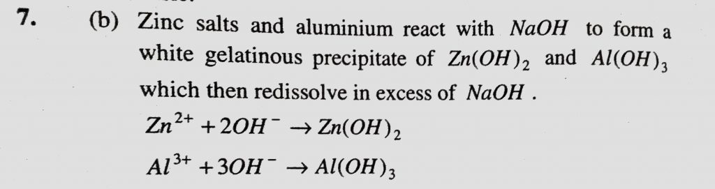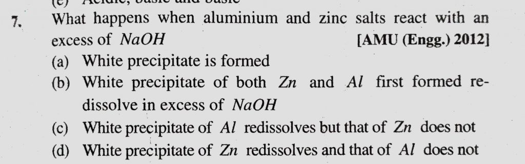 What happens when aluminium and zinc salts react with an excess of NaOH (a) White precipitate is formed (b) White precipitate of both zn and Al first formed redissolve in excess of NaOH What happens when aluminium and zinc salts react with an excess of NaOH (a) White precipitate is formed (b) White precipitate of both zn and Al first formed redissolve in excess of NaOH December 2, 2020 Category: Uncategorised (JEE Advanced Physics by BM Sharma + GMP Solutions) , Facebook Messenger WhatsApp Share this:TwitterFacebook Related