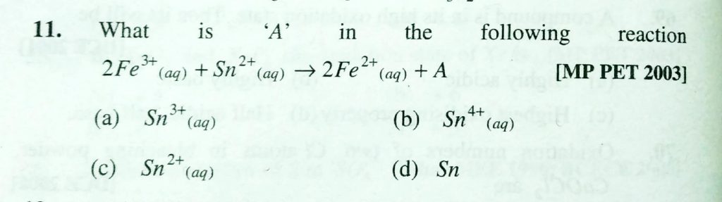 What is ‘A’ in the following reaction 2Fe^3+(aq) +Sn^2+(aq) gives 2Fe^2+(aq) +A What is 'A' in the following reaction 2Fe^3+(aq) +Sn^2+(aq) gives 2Fe^2+(aq) +A November 24, 2020 Category: Uncategorised (JEE Advanced Physics by BM Sharma + GMP Solutions) , Facebook Messenger WhatsApp Share this:TwitterFacebook Related