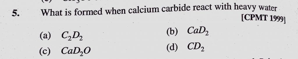 What is formed when calcium carbide react with heavy water (a) C2D2 (b) CaD2 (c) CaD2O (d) CD2 What is formed when calcium carbide react with heavy water (a) C2D2 (b) CaD2 (c) CaD2O (d) CD2 December 15, 2020 Category: Uncategorised (JEE Advanced Physics by BM Sharma + GMP Solutions) , Facebook Messenger WhatsApp Share this:TwitterFacebook Related