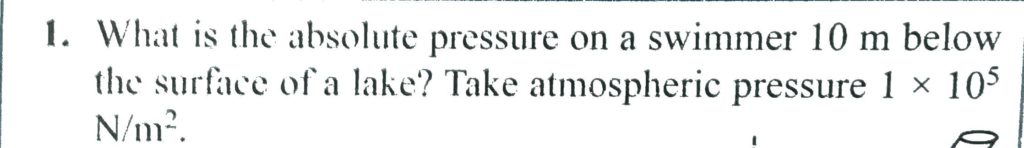 what is the absolute pressure on a swimmer 10 m below the surface of a lake? Take atmospheric pressure 1 x 10^5 N/m^2. what is the absolute pressure on a swimmer 10 m below the surface of a lake? Take atmospheric pressure 1 x 10^5 N/m^2. October 6, 2020 Category: Uncategorised (JEE Advanced Physics by BM Sharma + GMP Solutions) , Facebook Messenger WhatsApp Share this:TwitterFacebook Related