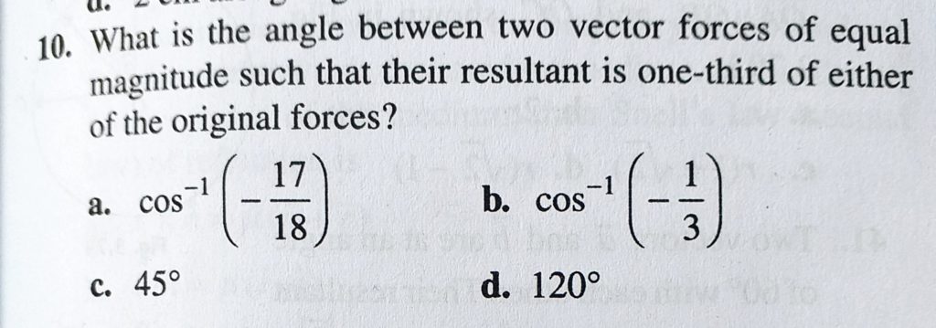 What is the angle between two vector forces of equal magnitude such that their resultant is one-third of either of the original forces? What is the angle between two vector forces of equal magnitude such that their resultant is one-third of either of the original forces? September 17, 2020 Category: Uncategorised (JEE Advanced Physics by BM Sharma + GMP Solutions) , Facebook Messenger WhatsApp Share this:TwitterFacebook Related