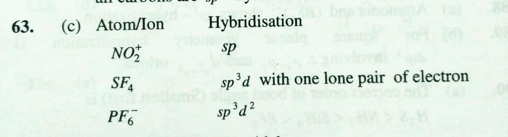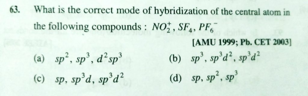 What is the correct mode of hybridization of the central atom in the following compounds : NO2^+ , SF4 , PF6^- PF6^- SF4 What is the correct mode of hybridization of the central atom in the following compounds : NO2^+ December 6, 2020 Category: Uncategorised (JEE Advanced Physics by BM Sharma + GMP Solutions) , Facebook Messenger WhatsApp Share this:TwitterFacebook Related