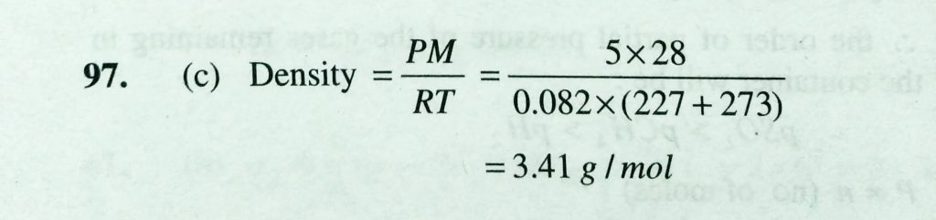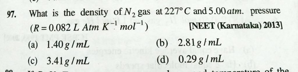 What is the density of N2 gas at 227 degree C and 5 .00 atm . pressure (R = 0.082 L Atm /K/ mol ) (a) 1.40 g/ml (b) 2.81 g/ml (c) 3.41 g/ml (d) 0.29 g/ml What is the density of N2 gas at 227 degree C and 5 .00 atm . pressure (R = 0.082 L Atm /K/ mol ) (a) 1.40 g/ml (b) 2.81 g/ml (c) 3.41 g/ml (d) 0.29 g/ml February 11, 2021 Category: Uncategorised (JEE Advanced Physics by BM Sharma + GMP Solutions) , Facebook Messenger WhatsApp Share this:TwitterFacebook Related