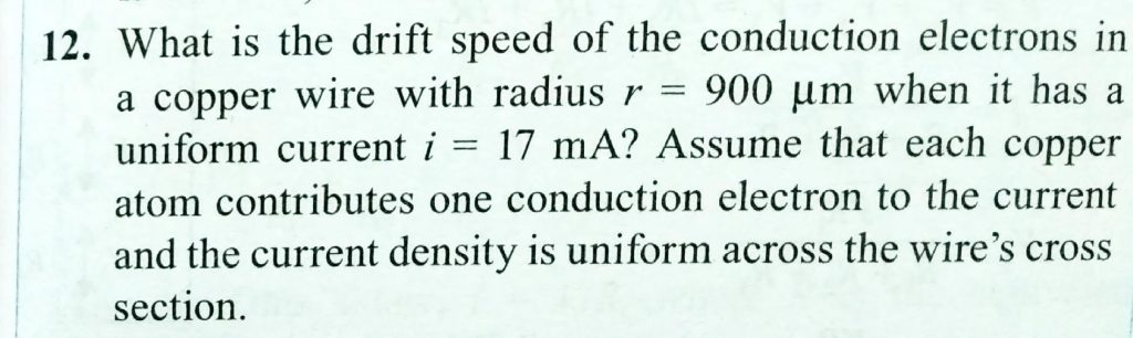 What is the drift speed of the conduction electrons in a coopper wire with radius r 900 um when it has a uniform current I = 17mA? Assume that each copper atom contributes one conduction electron to the current and the current density is uniform across the wire’s cross section.