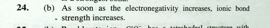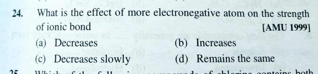 What is the effect of more electronegative atom on the strength of ionic bond (a) Decreases (b) Increases (c) Decreases slowely (d) Remains the same What is the effect of more electronegative atom on the strength of ionic bond (a) Decreases (b) Increases (c) Decreases slowely (d) Remains the same December 1, 2020 Category: Uncategorised (JEE Advanced Physics by BM Sharma + GMP Solutions) , Facebook Messenger WhatsApp Share this:TwitterFacebook Related