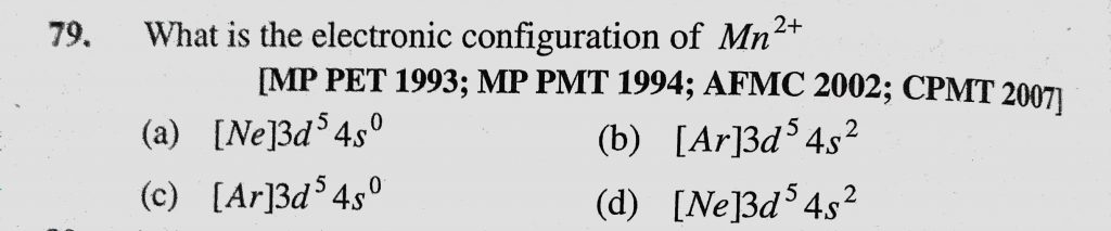 What is the electronic configuration of Mn2+ (a) (Ne)3d54s0 (b) (Ar)3d54s2 (c) (Ar)3d54s0 What is the electronic configuration of Mn2+ (a) (Ne)3d54s0 (b) (Ar)3d54s2 (c) (Ar)3d54s0 November 30, 2020 Category: Uncategorised (JEE Advanced Physics by BM Sharma + GMP Solutions) , Facebook Messenger WhatsApp Share this:TwitterFacebook Related