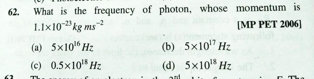 What is the frequency of photon , whose momentum is 1.1 x 10^-23 kg/ms^2 What is the frequency of photon whose momentum is 1.1 x 10^-23 kg/ms^2 November 27, 2020 Category: Uncategorised (JEE Advanced Physics by BM Sharma + GMP Solutions) , Facebook Messenger WhatsApp Share this:TwitterFacebook Related