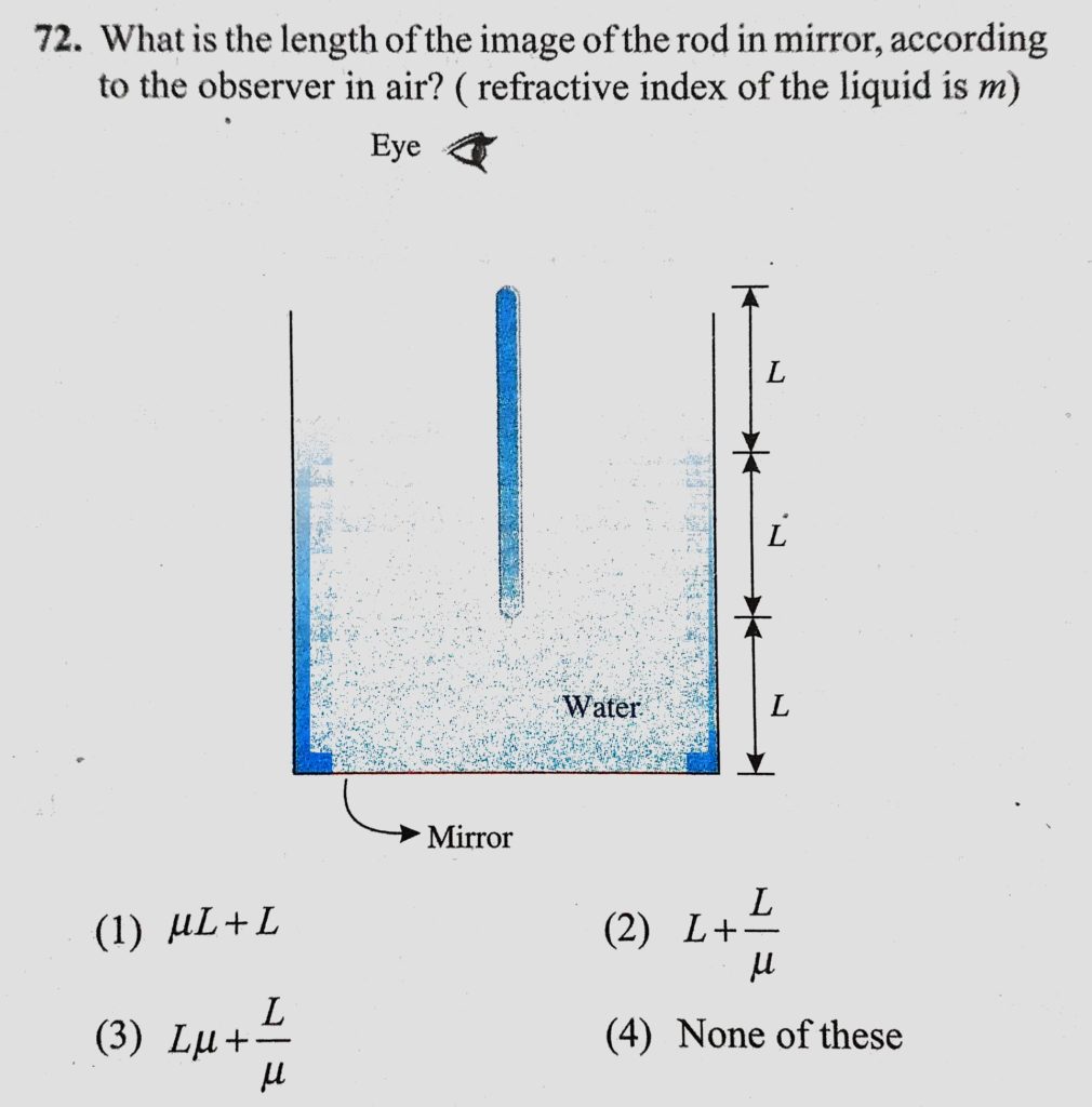 What is the length of the image of the rod in mirror, according to the observer in air? (refractive index of the liquid is m) according to the observer in air? (refractive index of the liquid is m) What is the length of the image of the rod in mirror October 6, 2020 Category: Uncategorised (JEE Advanced Physics by BM Sharma + GMP Solutions) , Facebook Messenger WhatsApp Share this:TwitterFacebook Related