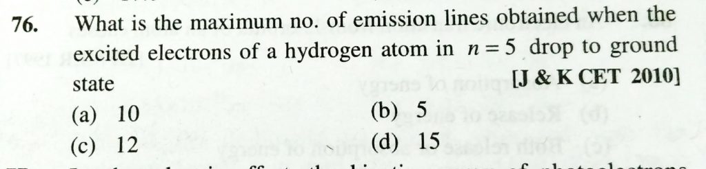What is the maximum no. of emission lines obtained when the exited electrons of a hydrogen atom in n = 5 drop to ground state What is the maximum no. of emission lines obtained when the exited electrons of a hydrogen atom in n = 5 drop to ground state November 27, 2020 Category: Uncategorised (JEE Advanced Physics by BM Sharma + GMP Solutions) , Facebook Messenger WhatsApp Share this:TwitterFacebook Related