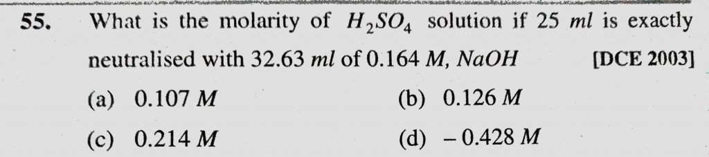 What is the molarity of H2SO4 solution if 25 ml is exactly neutralised with 32.63 ml of o.164 M, NaOH NaOH What is the molarity of H2SO4 solution if 25 ml is exactly neutralised with 32.63 ml of o.164 M December 7, 2020 Category: Uncategorised (JEE Advanced Physics by BM Sharma + GMP Solutions) , Facebook Messenger WhatsApp Share this:TwitterFacebook Related