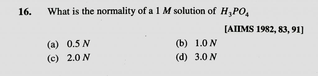 What is the normality of a 1 M solution of H3PO4 (a) 0.5 N (b) 1.0 N (c) 2.0 N (d) 3.0 N What is the normality of a 1 M solution of H3PO4 (a) 0.5 N (b) 1.0 N (c) 2.0 N (d) 3.0 N December 10, 2020 Category: Uncategorised (JEE Advanced Physics by BM Sharma + GMP Solutions) , Facebook Messenger WhatsApp Share this:TwitterFacebook Related
